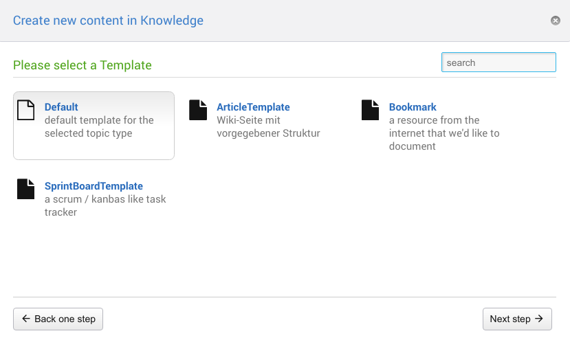 Once you selected the type of content to be created there is an optional second step to select the TopicTemplate available in the current web tailored towards the selected TopicType. This step will be skipped