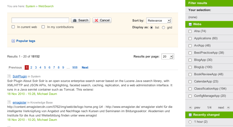 performance improvements of indexer; implemented instant search; new crawler interface to index not only wiki content but also external sources; new filesystem crawler; eased configuring the search interface with preference variables; extended solr schema to cope with multiple data sources; improved handling of substring searches in text fields; require validation and authentication in rest handlers; removed hardcoded WorkflowPlugin support (plugins need to hook into the indexing api instead); added support for formfields of type number, percent, currency and bytes; improved indexing of used makros in a page; improved detection of outgoing links while indexing; changed handling of admin rights on content, i.e. not granting admin rights on external sources; improved autosuggestion dropdown search; added api to iterate over facet values while ignoring access rights |